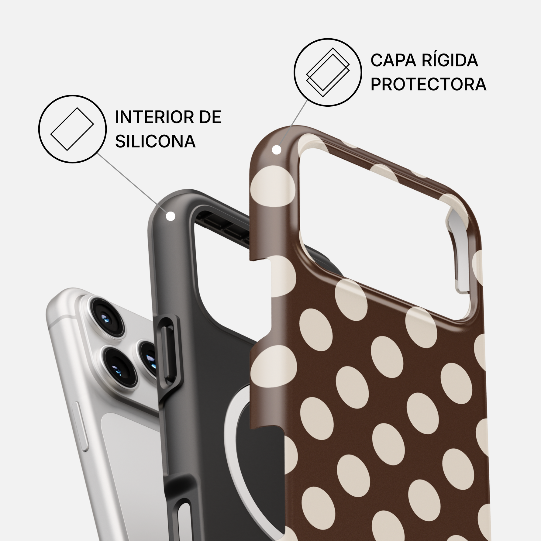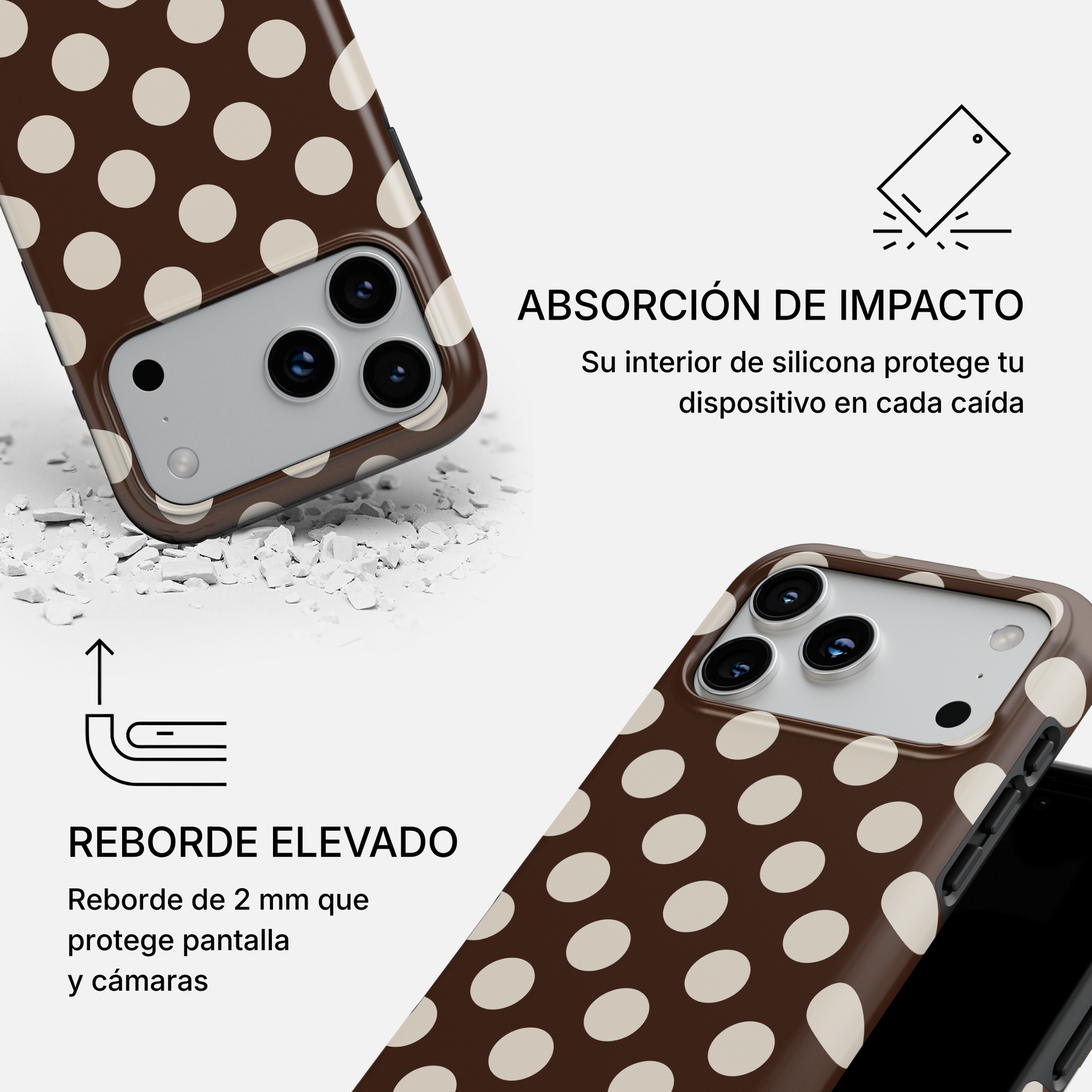 Nuestras fundas están diseñadas para brindar protección total frente a golpes, caídas y rayones. Su estructura rígida de policarbonato (PC) ofrece gran resistencia, mientras que la capa interior de silicona absorbe impactos y protege tu dispositivo.