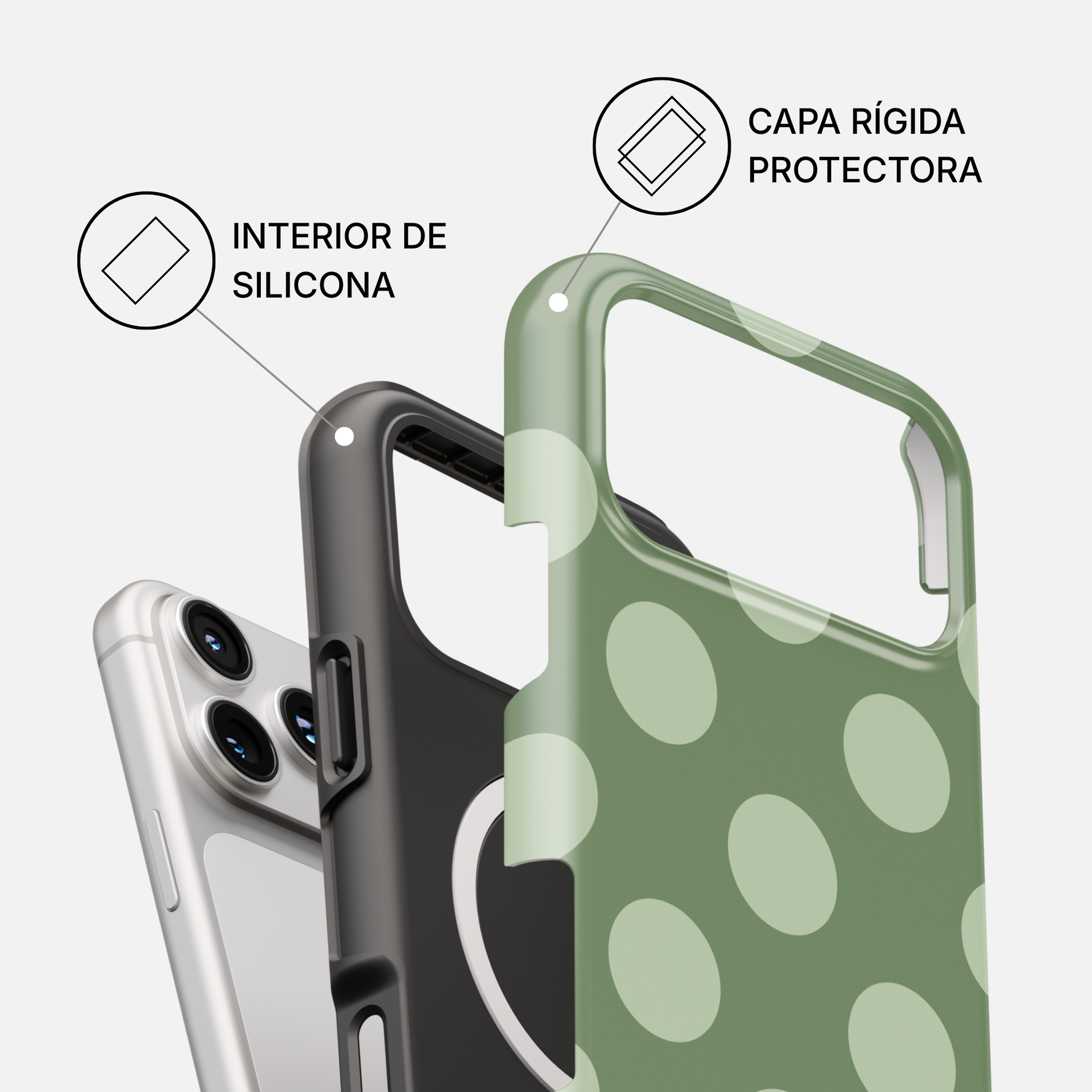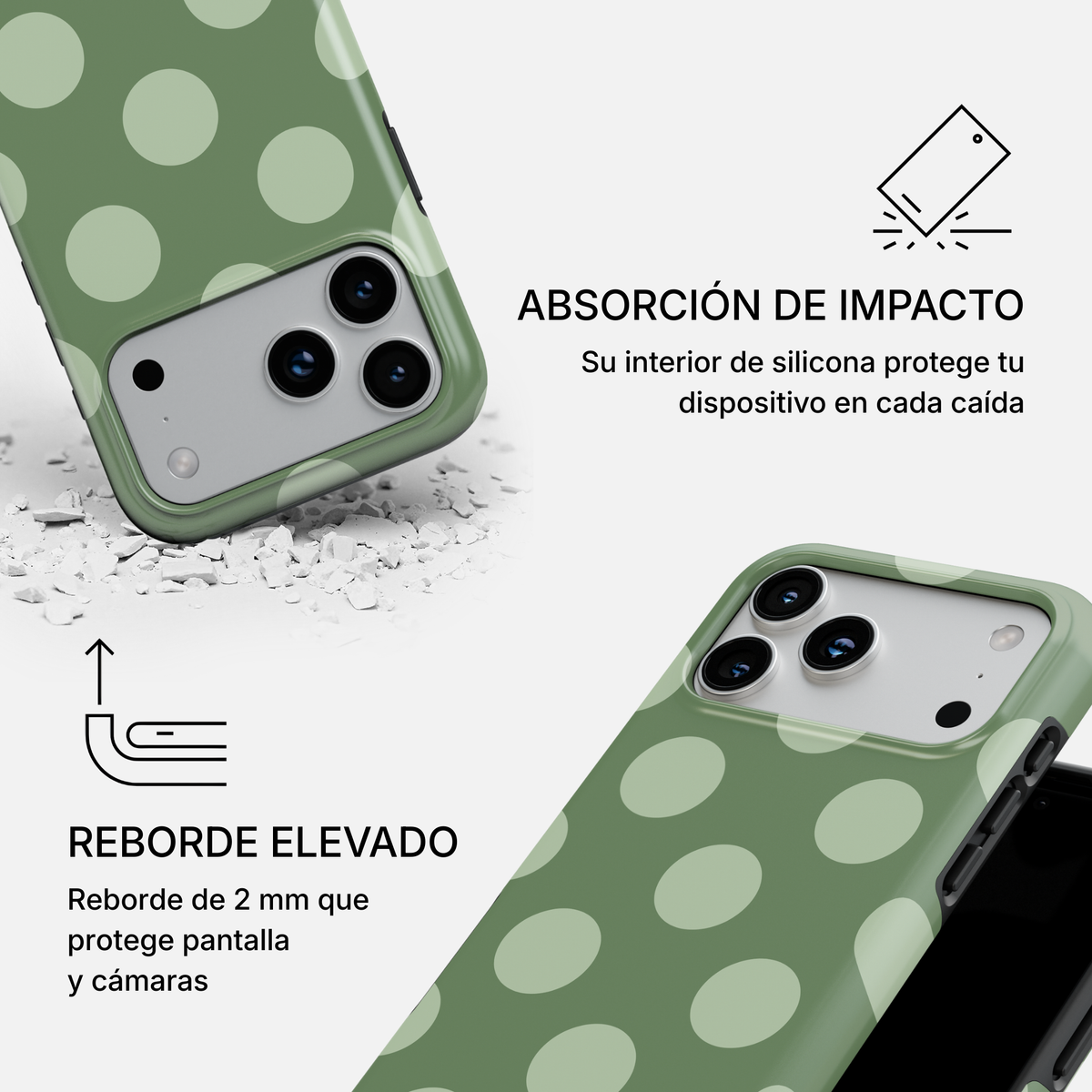 Nuestras fundas están diseñadas para brindar protección total frente a golpes, caídas y rayones. Su estructura rígida de policarbonato (PC) ofrece gran resistencia, mientras que la capa interior de silicona absorbe impactos y protege tu dispositivo.