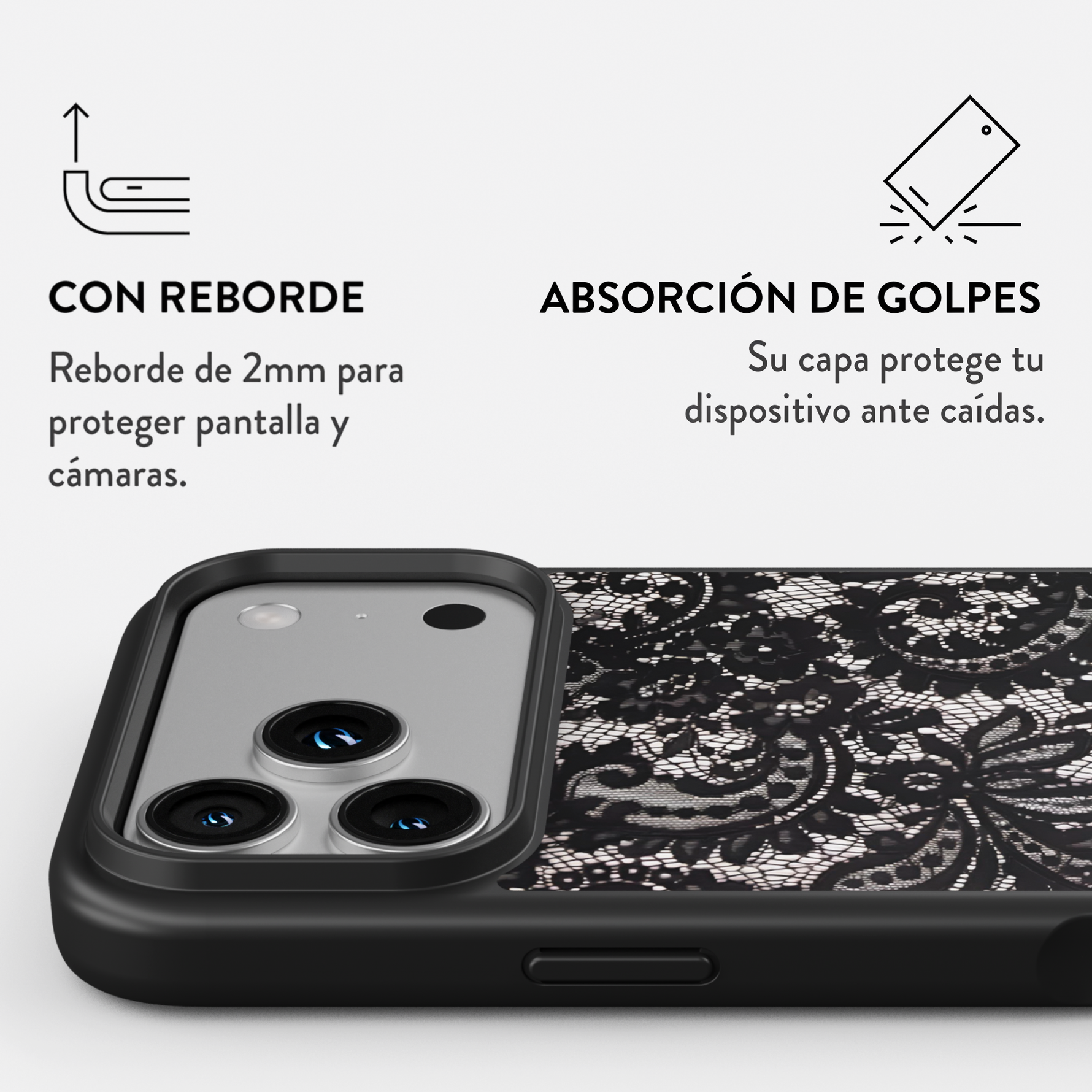 Todas nuestras fundas cuentan con un reborde elevado alrededor de la cámara, diseñado para evitar el contacto directo con superficies planas y proteger las lentes de rayones o daños.